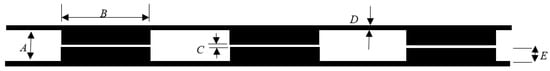 As mentioned earlier, the PIN diodes have been placed in two strategically placed gaps incorporated within the outer loop. The PIN diodes are then subjected to a biasing process facilitated by a designated bias line. Figure 4 illustrates the proposed loop antenna that incorporates a single CPS to supply the DC bias current to the two PIN diodes. The surface current distribution of the antenna with a CPS bias line is presented in Figure 4b. A periodic current distribution is observed along the bias line due to the RF current leakage from the antenna. Such current leakage results in unwanted electromagnetic radiation and causes the bias line to function as a radiating element with fields that interfere with and distort those radiated by the antenna, particularly the CP radiation. This is in addition to altering the antenna’s key characteristics, including resonance frequency, input impedance, AR, gain, and radiation pattern. To mitigate this issue, the development of a novel bias line structure is imperative one that effectively carries the requisite DC bias current while preventing the unwanted flow of RF current. To curtail RF current propagation within the coplanar strip line, a PBG structure with a period of λeff/4 has been integrated into the bias line, as illustrated in Figure 5 [], to present a high impedance that minimizes the leakage of the RF current along the CPS line. Therefore, the PBG structure effectively acts as an RF choke that suppresses the flow of RF current signal along the coplanar strip line, thereby ensuring optimal performance and efficiency. The PBG section consists of a sequence of high and low quarter wavelength impedance transformer sections. The gap between the lines of the high-impedance section is defined as A, the PBG cell’s length is B, the gap between the thicker lines of the low-impedance PBG cells is C, and the widths of the CPS line are D and E. The design parameters for the CPS bias line and PBG are summarized in Table 3.