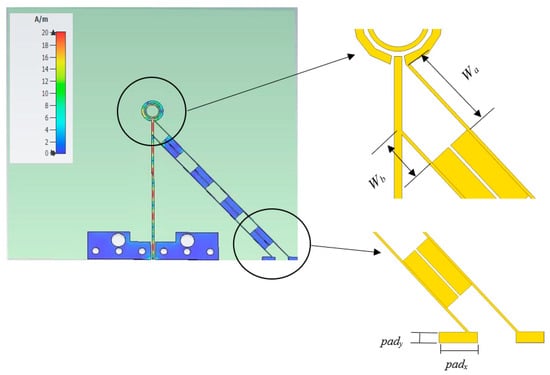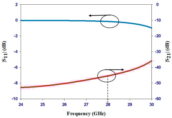 Figure 6 showcases the reflection and transmission coefficients of the RF choke through the utilization of two ports positioned at each end of the biasing line. Notably, the stopband of the proposed RF choke encompasses the antenna’s operating bandwidth. On the other hand, Figure 7 presents the antenna’s surface current distribution along the CPS-PBG bias line at 28 GHz, where it can be noted that adding the PBG sections effectively cuts off the RF current from flowing across the CPS line, which means the CPS-PBG line serves the purpose as a distributed RF choke. Furthermore, as can be observed from Figure 7, the biasing network has been connected to the circular loop using strip line sections with lengths of Wa and Wb that have been adjusted for optimum matching.