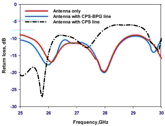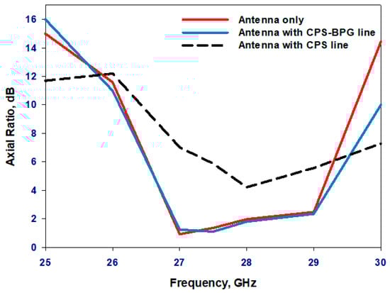 Figure 8 and Figure 9 present the variations of reflection coefficient and axial ratio, respectively, for various antenna configurations; without any biasing, with the CPS line alone, and after the additions of the PBG to the CPS lines. It can be noted from these results that adding the CPS line without the PBG has deteriorated the performance significantly due to the undesired flow of the unbalanced RF current. On the other hand, the performance of a standing-alone antenna has been preserved by adding the PBG to the CPS line to achieve the equivalent of an RF choke that stops any RF current flowing along the biasing network over the desired frequency range. In addition, the antenna performance has been preserved across the operating bandwidth, which demonstrates that the CPS-PBG stopped the RF current leakage over a relatively wide frequency range compared to that of a traditional filter.