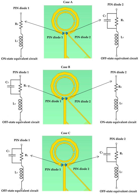 Structures of achieving different polarizations by using two PIN diodes. Case A: when the PIN diode 1 is forward biased, that is usually defined as the “ON” state. Case B: when PIN diode 2 is forward-biased. Case C: when the two PIN diodes are under zero-biased conditions.