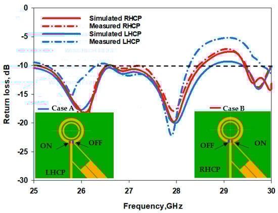 It should be noted that the RHCP and LHCP modes have been achieved when a single PIN diode is forward-biased while the other PIN diode is reverse-biased. On the other hand, when both PIN diodes are under zero-bias conditions, the LP mode is achieved with dual narrow impedance bandwidths since the total impedance presented by the two unbiased diodes at the input of the antenna is different from that presented using one forward, and one reverse, biased PIN diodes. Therefore, the proposed configuration offers the distinct advantage of offering hybrid reconfigurability by varying polarization and bandwidth without any compromise on the performance. To the best of the authors’ knowledge, this is the first attempt to design a mmWave antenna that offers hybrid reconfiguration. It may be worth pointing out that bandwidth reconfigurability received increased interest in recent years since an antenna with bandwidth control could partially perform a filtering task as well as the radiation [,,].
