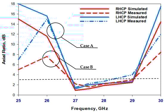 Figure 14 illustrates a compelling comparison between the simulated and measured reflection coefficients, where the minimum S11 has been achieved at 28 GHz in all cases. This analysis delves deeply into the distinct cases of the proposed antenna with RHCP and LHCP modes. The simulation draws out intriguing details. Upon configuring the antenna in Case A, it achieves a 13.3% impedance bandwidth compared to 13.7% in Case B centered at 28 GHz in both cases. What adds credence to these findings is the alignment between measured and simulated impedance bandwidths. In Case A, the measurements mirror the simulation closely, showcasing a 12.7% impedance bandwidth, and in parallel, Case B achieves 11.2% bandwidth a strong testament to the reliability and consistency of the antenna’s performance across these divergent scenarios. The measured and simulated axial ratios are demonstrated in Figure 15 for both cases of LHCP and RHCP. In the scenario of Case A, the simulated 3 dB AR bandwidth covers approximately 8.1% within the frequency range of 26.75 to 29 GHz, effectively achieving LHCP radiation. The measured 3 dB AR bandwidth in Case A ranges from 26.85 to 28.9 GHz, with a bandwidth of circa 7.42% which is in close agreement with simulations. On the other hand, Case B offers a simulated 3 dB AR bandwidth of roughly 7.64%, spanning the frequency band from 26.89 to 29 GHz, while achieving the RHCP radiation. Concurrently, the corresponding measurement outcome registers around 60%, overlapping frequencies from 25 to 28.35 GHz. The simulated and measured realized gain radiation patterns for LHCP and RHCP senses are presented in Figure 16 and Figure 17 for cases A and B at 28 GHz. The measured radiation patterns mostly follow the simulated counterparts with slight differences due to the measurement errors at the mmWave frequency range. Remarkably, in both cases, the maximum radiation pattern is emitted in the broadside direction resulting in an LHCP wave in Case A and an RHCP wave in Case B.