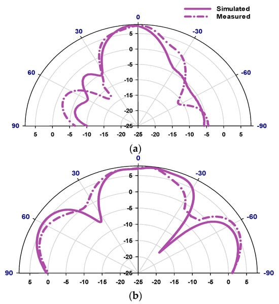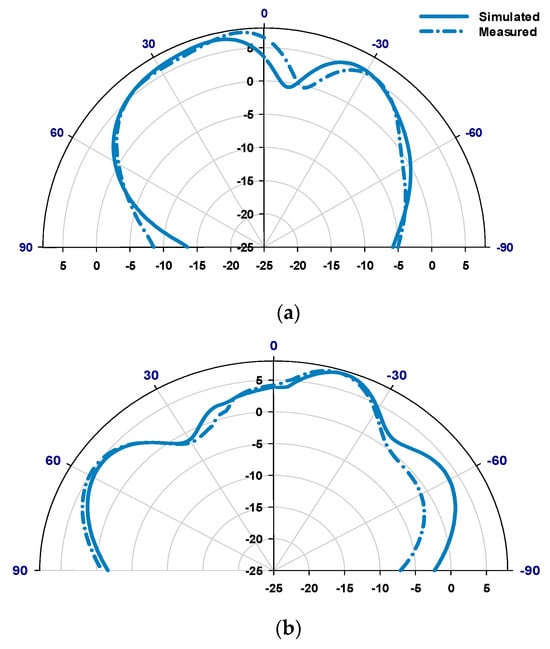 Radiation patterns for the antenna in Case B at 28 GHz, (a) ϕ = 0°, (b) ϕ = 90°.