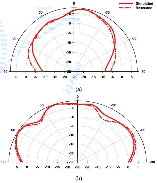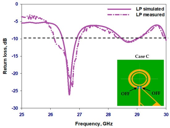 Figure 18 presents the reflection coefficient when the two PIN diodes are under zero bias, where it can be noted that matching is achieved over dual narrow bands centered at 26.8 GHz and 29 GHz with considerably narrower bandwidths compared to that in the CP states. Namely, bandwidths of 3.4% and 2.1% have been achieved in the simulation compared to 2.3% and 1.9% in the measurements. The discrepancy can be attributed to the fact that the actual equivalent circuit of an unbiased PIN diode may be different from that of a reverse-biased PIN diode, which was used in the simulations. Figure 19 presents the simulated and measured realized gain patterns of the antenna within Case C at 27 GHz with close agreement. This configuration enables the LP radiation at different operating frequencies.