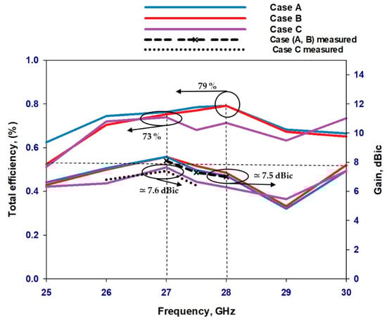 Figure 20 illustrates the total efficiency and realized gain for the circular polarization and linear polarization modes. The simulated total efficiency remains consistent at circa 79% across the desired CP bandwidth, which demonstrates excellent performance for a reconfigurable antenna operating in the mmWave frequency range. The improvement in efficiency can be attributed to several factors such as the absence of lumped inductors and capacitors in the biasing network. This is in addition to utilizing a single biasing network for the two diodes instead of the common approach of utilizing a separate biasing network for each diode. This is in addition to employing a low-loss dielectric constant substrate. On the other hand, the PIN diode is associated with losses that have been accounted for in the achieved total efficiency of 79%. However, when considering Case C, it’s worth noting that the total efficiency at 27 GHz exhibits a slight reduction, to approximately 73%. This could be attributed to the higher resistances offered by the two PIN diodes. In addition, the comparison reveals a close correspondence between the measured and simulated realized gains. In Case A and Case B, the measured and simulated realized gain is circa 7.5 dBic at 28 GHz. On the other hand, Case C exhibits a realized gain of approximately 7.6 dB at 27 GHz.