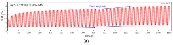 According to Al-Dahawi, Luo et al. it was shown that the effect of the polarization effect is persistent and does not disappear during the loading process [37,38]. Consequently, an instable conductive network undermines the sensor’s capacity to counteract the polarization effect, leading to a slip in the pressure-sensitive curve. The data in Figure 10 and Figure 11 for G1 and G2 provide a detailed illustration of this phenomenon. Nevertheless, increased AgNP quantities can effectively control slippage. Nonetheless, excessive dosages do not ensure a positive outcome. The surplus use of conductive fillers can lead to AgNPs contacting each other, causing a shift from electron-leaping to contact conductivity. This shortens the sensor’s ΔFCR, as depicted in Figure 11.