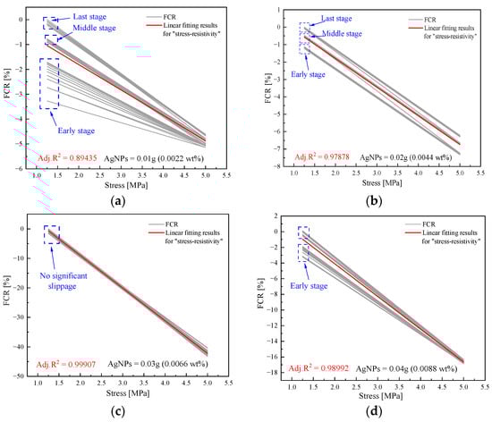 Cyclic loading is the optimal test method for assessing the stability of the pressure-sensitive curve in the self-sensing cementitious materials. To accurately reflect the stability of AgNP self-sensing cementitious materials under the background of long cycle loading, the test involved 120 ultra-long cyclic loading cycles at a rate of 1 kN/s and stress variations ranging from 1.25 MPa to 5 MPa. Linear fitting was applied to supplement the evaluation of the self-sensing properties of the sensors. The results are shown in Figure 10.