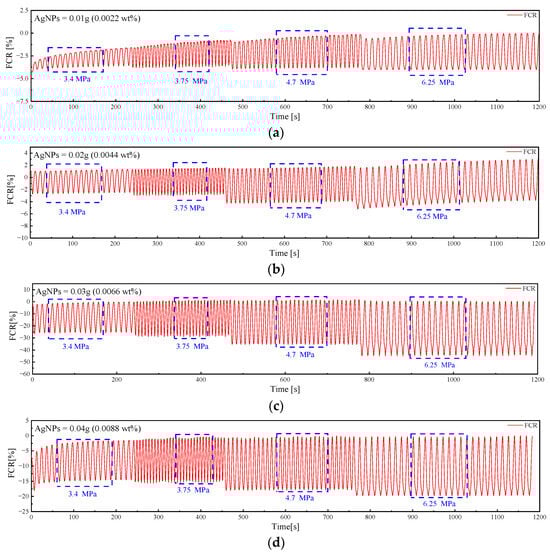 ΔFCR represents the relative difference in FCR during each loading cycle, as shown in Figure 11. Upon observing the data, it is evident that ΔFCR exhibits a trend of initially increasing and then decreasing with the gradual rise in AgNP content. The peak value is observed at G3 (0.0066 wt%), reaching 41.92%. The data for AgNPs demonstrates a significant advantage when compared to other similar studies. In Mardani et al.’s study, the CNT self-sensing cementitious material showed a change in FCR of less than 10% over the loading interval of 0.625–6.25 MPa [35]. Similarly, in Suo et al.’s study on graphene oxide self-sensing cementitious material, the sensor’s FCR change was also less than 10% at pressures ranging from 0 to 15 MPa [36].
