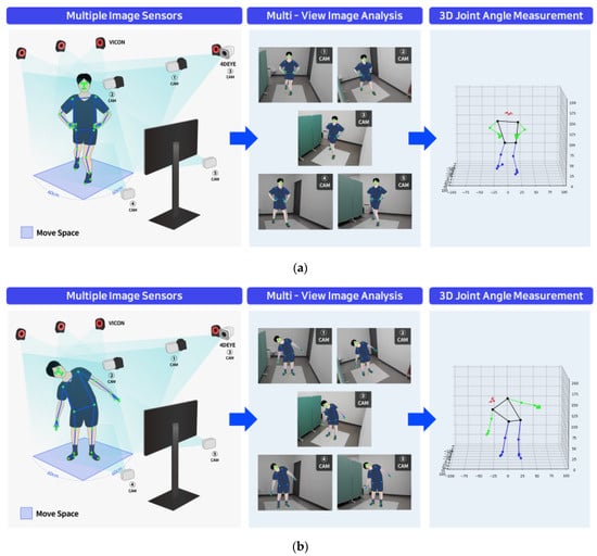 Accurate analysis of dynamic motion in fields such as automobile navigation, robot control, and wearable devices is one of the key factors in increasing technological progress and applicability, while dynamic motion evaluation is one of the important ways to precisely measure and evaluate human motion [1]. This need is mainly related to Inertial Measurement Units (IMUs). IMUs are devices composed of various sensors such as accelerometers, gyroscopes, and magnetometers, which are used to accurately measure the motion of objects. IMUs are applied to acceleration, rotation, and location tracking of vehicles in car navigation, whereas robot control utilizes robot motion and posture control. It is also utilized to monitor user movements and activities in wearable devices [2]. However, IMUs often have their limitations such as the accuracy and the sensor drift. Therefore, more sophisticated algorithms are needed with the support of advanced sensor technology to perform dynamic motion evaluation more precisely. As the demand for precise and accurate methods for evaluating human movement has continued to increase over the past decade, the importance of evaluating postural or movement damage to address musculoskeletal dysfunction has recently been recognized [3]. Using the latest technologies and equipment, various studies have analyzed compensation and abnormal posture, which involve movements outside the body’s established standard range [4,5,6]. Analyzing damaged human movements and asymmetric postures can quickly identify injury risk factors, reducing patient recovery time and enabling more effective treatment plans [7,8]. Most published studies involving human kinematics have used three-dimensional (3D) motion analysis systems, which are expensive, time consuming, and generally not widely available in the clinical field [9]. VICON®, a typical 3D motion analysis system, is the most commonly used standardized approach in motion analysis. Nevertheless, it can be time consuming because of the expensive device, limited inspection environment, various limitations involving the use of sensors and markers [10], and expertise for equipment use. With the development of related technologies, low-cost and efficient solutions have emerged for evaluating the human body. Two-dimensional (2D) red, green, and blue (RGB) sensors have become affordable alternatives to 3D systems [11,12]. The 2D RGB sensor is cheap and easy to carry; therefore, it is useful for simple motion analysis or measurement. However, the reliability of the measurement value is significantly reduced for precise motion analysis.