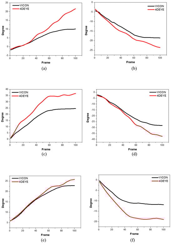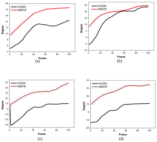 The measurement methods using the 4DEYE® and VICON® systems were different; therefore, there was a slight difference in the angle values. In addition, artificial errors may have occurred since the start and end times of the 4DEYE® and VICON® devices were manually operated by the researcher, not automated. VICON® proceeded with the processed data after performing; in that case, the number of data frames was unified to 100. However, the data that were not processed after the performance showed a relatively large angle difference from 4DEYE®. When matching VICON® (Figure 1b) and 4DEYE® (Figure 1a,b), it was proceeded by referring to these images.