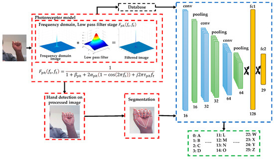 In recent years, there has been great interest in the use of artificial intelligence techniques, specifically of CNNs for sign language recognition [17,18,19]. Below, works related to the study of sign language assisted by artificial intelligence are presented, as well as studies that implement bioinspired retina models.
