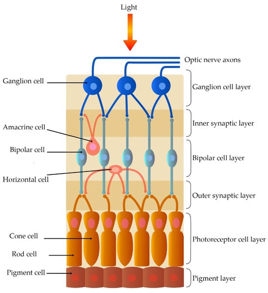 Once it enters the eye, light is absorbed in the Outer Plexiform Layer (OPL), composed of photoreceptors (cones and rods), as well as horizontal and bipolar cells. Subsequently, light enters the Inner Plexiform Layer (IPL), which comprises the response of the bipolar, amacrine, and ganglion cells (see Figure 2).