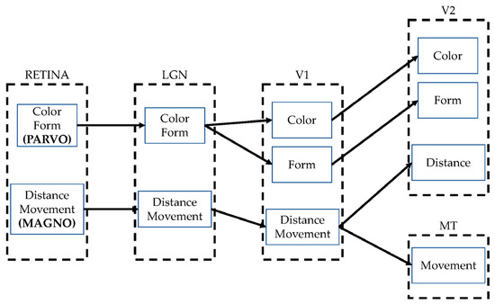 Given that the outer and inner plexiform layers are a set of fused low pass and high pass filters that form a space-time filter, image processing is mainly conducted in the frequency domain, which facilitates obtaining the Parvocellular channel (Parvo) and the Magnocellular channel (Magno). Both ways are closely related, but each transports a specific aspect of the scene, as shown in Figure 3. The use of Parvo generates detail extraction, which responds to the question what is this? In turn, motion information extraction is obtained with Magno, which answers the question where is it? Both channels are connected to the Lateral Geniculate Nucleus (LGN) from which information is sent to the diverse areas corresponding to visual processing, namely V1, V2, V3, V4, and V5, among others [38,39].