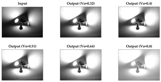The mathematical model allows for modifying the brightness of the darker pixels while keeping lighter pixels constant or close to their value. To verify this effect, Figure 5 presents the response of the photoreceptor system to multiple values of V 0 . Figure 6 below shows the effect of the response of the photoreceptor system (with V 0 = 0.7 ) in an extreme unfavorable case since dark tones tend to predominate in the image (normal image).