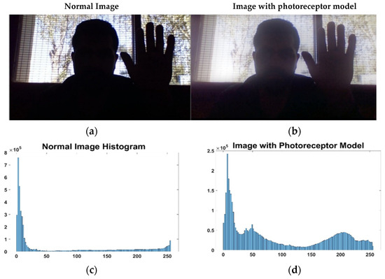 Figure 6. Example of response of the photoreceptor model with V0 = 0.7: (a) original image entering the system, (b) image processed by bioinspired photoreceptor cells, (c) histogram of image (a), and (d) histogram of image (b).