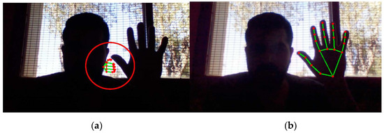 Figure 8. Extraction of the 21 points of interest: (a) original image with failed hand detection by MediaPipe library and (b) image processed by bioinspired photoreceptor cells with successful hand detection by MediaPipe library.