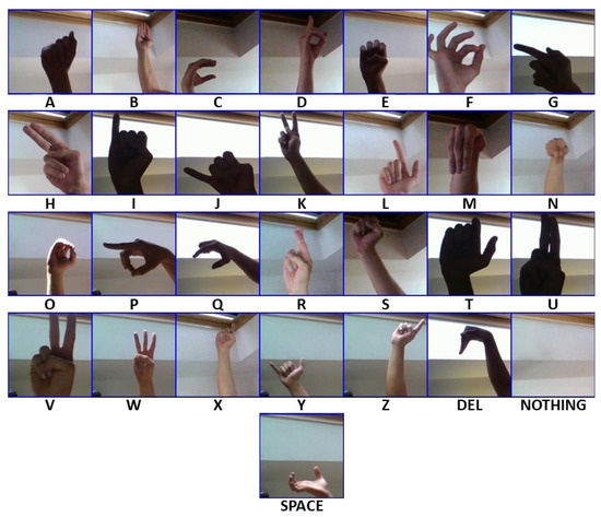 There is a wide variety of online datasets to solve different cases of interest, such as detection and classification of objects, numbers, colors, or any specific pattern. This research addresses the classification of American sign language, but focused on the letters of the alphabet. For this reason, use is made of [16] which claims to have 87,000 images which are 200 × 200 pixels. There are 29 classes, of which 26 are for the letters A–Z and three classes are for SPACE, DELETE, and NOTHING. Figure 9 shows a sample per class of said dataset.