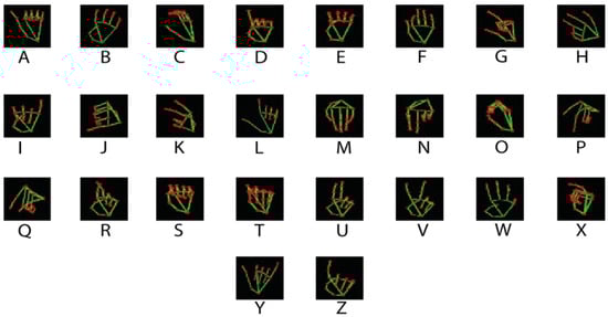 It should be noted that from the dataset of [16], two additional datasets are generated, which will allow training three different models, the first being trained with the dataset without prior processing, the second model being trained with images processed by bioinspired photoreceptor cells, and the third model being trained with a dataset obtained from the images processed by photoreceptor cells, and subjected to the MediaPipe library in order to extract the landmark of the hand position which contains the 21 points of the joint. Figure 10 exemplifies the third dataset to be used.
