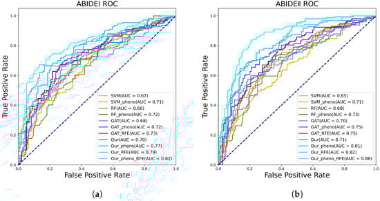 ROC curve comparison of different methods. (a) Different methods of ROC on ABIDE I. (b) Different methods of ROC on ABIDE II.