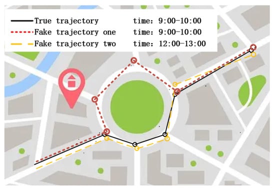 During the process of k-anonymizing trajectories, researchers leverage the similarity of certain trajectory data to anonymize them effectively, preventing attackers from discerning the user’s real trajectory. The method described in [] for publishing an anonymous trajectory is based on the generation of secure starting and ending points, the generation of candidate sets containing secure starting and ending points based on user habits, the generation of anonymous trajectories in both directions, and the correction of the accessibility of location points on each anonymous trajectory using access probabilities. Zhou and Wang [] combined a fog computing and k-anonymity approach to protect trajectories, using fog computing to provide users with local storage and mobility and k-anonymity techniques to construct hidden regions for each trajectory snapshot based on time-dependent query probabilities and transfer probabilities to solve the problems of real-time trajectory privacy protection and offline trajectory data protection for continuous queries. Nevertheless, the trajectory k-anonymity technique possesses certain limitations. For instance, attackers can deduce the actual trajectories of users by discerning information disparities (e.g., time, space) among different users [,]. As shown in Figure 1, the attacker must distinguish between the user’s real trajectory (represented by a solid line) and the first fake trajectory (represented by a dotted line), which the attacker can easily distinguish because the two trajectories take different paths in the middle segment, which is the area through which the attacker distinguishes the user’s real trajectory. The attacker cannot distinguish between the real trajectory and the second fake trajectory (represented by a dashed line) because their routes are identical. However, because the real trajectory is generated between 9:00 and 10:00 and the second fake trajectory is generated between 12:00 and 13:00, the attacker can infer the real trajectory of the user using the time information of the trajectories. Thus, it can be seen that the method of selecting trajectories that meet the requirements of trajectory anonymity is the key to trajectory k-anonymity.