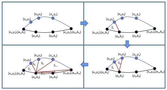 We use the triangulation method [] to evaluate the area enclosed by two sub-trajectories. We give an example (shown in Figure 2) to illustrate the specific evaluation process. Suppose, in Figure 2, the real sub-trajectory is , , …, , and the historic sub-trajectory is , , …, , where = , = and and are usually small integers. First, we obtain the area of the triangle formed by the three location points , , , , , by calculating = · + + − − − , where i is between 1 and . Then, we calculate the area of the triangle formed by , , , , , , the area of the triangle formed by , , , , , , …, and the area of the triangle formed by , , , , , . Finally, the area of the two sub-trajectories is S = + + … + .