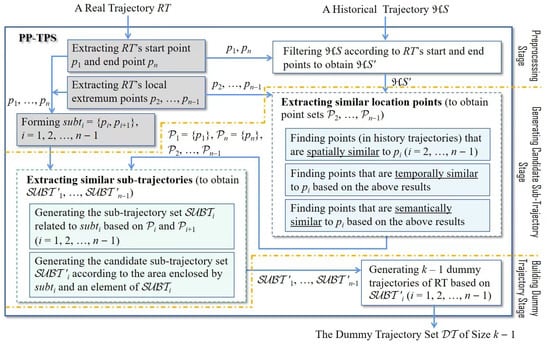 After that, PP-TPS enters the “generating a candidate sub-trajectory stage”. In this stage, PP-TPS first finds all points on the trajectories included by that are similar to (i= 2, …, ) in the aspects of time, space, and semantics, and uses to denote the set of the found points. Note that and are set to and , respectively. Subsequently, PP-TPS searches a point from and a point from (i = 1, 2, …, ), both of which have the same label, indicating that and come from the same historic trajectory. If PP-TPS finds such and , it intercepts the segment of the corresponding historic trajectory between and and pushes this segment into . Then, PP-TPS further filters the sub-trajectories of based on their enclosed areas with to obtain the candidate sub-trajectory set . Suppose the size of the space contained with one sub-trajectory of and is less than . In that case, PP-TPS considers that this sub-trajectory is similar to , a candidate used to create ’s dummy trajectories.