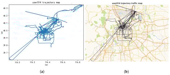 Trajectory map of the 14th user. (a) GPS map; (b) latitude and longitude coordinate system.