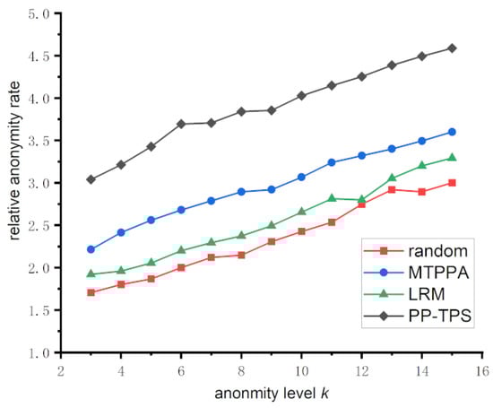 Relative anonymity is a measure of the proportion between the covered locations within the anonymous area and the anonymity level k, and this proportion must never be less than 1. In other words, the greater the relative anonymity, the greater the number of users involved, indicating a higher level of privacy protection. Figure 6 displays the trend of relative anonymity with respect to the change in k value. The horizontal axis represents the anonymity level k, while the vertical axis represents the relative anonymity.
