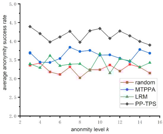 In the context of privacy protection within location-based services, a higher level of anonymity ensures that a user’s query location is more effectively concealed. This makes it harder for attackers to figure out the user’s coordinates, resulting in better privacy protection. This translates to a higher degree of privacy protection. Conversely, a lower degree of anonymity implies a lower level of privacy protection. In this paper, we analyze the privacy protection degree using the anonymity success rate, depicted in Figure 5. The figure illustrates the anonymity success rates for various numbers of mobile users across varying anonymity privacy degrees.