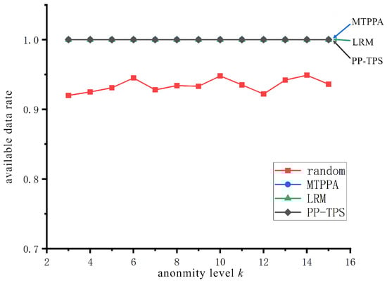 Figure 7 assesses the available data rate across the four approaches. It can be observed that the data availability rate is 1 for all approaches except the Random method, which varies depending on the trajectory anonymity level k. This discrepancy is because the other schemes rely on historic trajectories and generate real trajectories using different algorithms. It is important to note that the data availability rate for the Random method falls below 1. This is attributed to the random selection of locations for real trajectory generation in this scheme, which may include points in inaccessible areas, such as the center of a large river, where location points cannot be generated. Our PP-TPS approach filters location points based on historic track protection, which are real user-generated location points containing real information, all of which are available data.