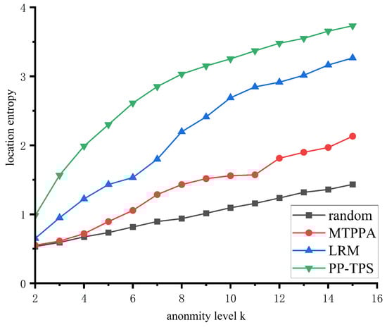 The effectiveness of positional privacy protection in trajectory semantics can be evaluated by using location entropy [], which measures the effectiveness of positional privacy protection. When positional entropy is high, the trajectory semantics become more alike. The formula used to calculate positional entropy is as follows: . Among these variables, N represents the number of trajectory positions, represents the frequency of semantics at position i, and T represents the total frequency of all semantics in the text. Figure 8 displays the experimental comparison of various anonymity levels.