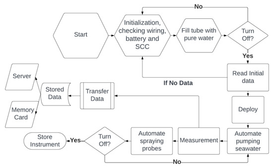 The principle of NOBEL-BOX is to combine several probes, including ones to determine seawater temperature, air temperature, pH, salinity, TDS, and DO. These probes are connected to a microcontroller. A pump system was added to facilitate the supply of seawater samples measured by this instrument. In general, this instrument is shaped like a box with the dimensions of 30 × 40 × 20 cm with a total weight, including when all components are assembled within the housing, of around 15 kg. With this weight and dimension, it is hoped that this instrument can be placed on various ships, including small wooden ships. This instrument can automate self-cleaning by spraying pure water onto the probes to minimize data bias from previous measurements. Furthermore, the measurement data are stored on a micro-SD card that can be transferred to a desired server using a mobile communications (GSM) system. The instrument system operation device uses Arduino Uno R3 and Arduino Mega 2560 microcontrollers manufactured by Arduino, Turin-Italy (Figure 1).