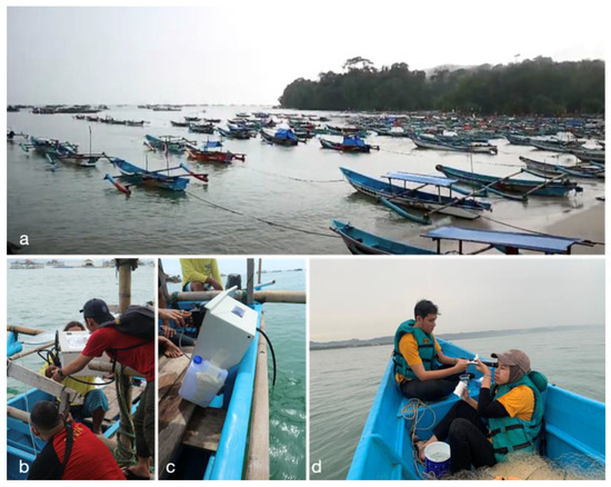 Sea trial in Pangandaraan beach, (a) sea condition during the test and type of wooden boat used, (b) team and NOBEL-BOX mobilization, (c) seawater pumped into the instrument (black water hose), and (d) measurements using other portable instruments at the ship’s bow.