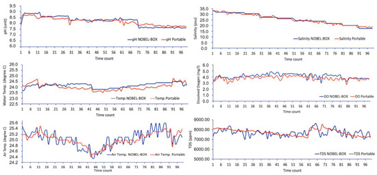 The data results obtained from NOBEL-BOX compared to those of other portable devices, both in laboratory and field test settings, provided time-series data (Figure 6). The data obtained can be processed using M.S. Excel or Ocean Data View (ODV) software to be presented as graphs to observe temporal or spatial data [43].