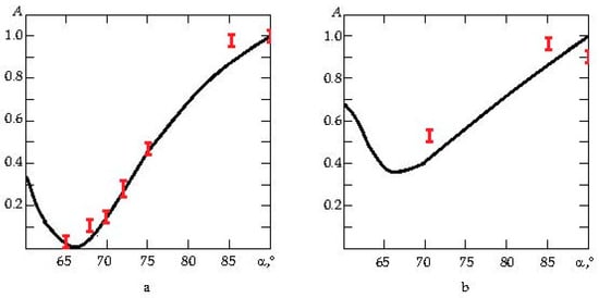 (a) Change in the coefficient A as the function of the angle of inclination α for the excitation frequency 2.5 MHz; (b) change in the coefficient A as the function of the angle of inclination α for the excitation frequency 1.25 MHz.