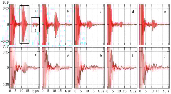 Piezoelement output voltage at 1.25 MHz at the angles of inclination α: (a) 60°, (b) 62°, (c) 64°, (d) 66°, and (e) 68° and at 2.5 MHz at the angles of inclination of α: (f) 60°, (g) 62°, (h) 64°, (i) 66°, and (j) 68°. 1—signal reflected from the back side of the damper, 2—signal caused by re-reflections inside the damper.