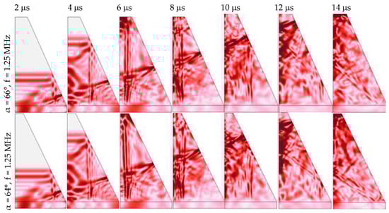 As an example, Figure 4 shows changes in the wavefront in time for the frequency 1.25 MHz for α = 64° and α = 66°. One can note that near the back of the damper, the signal receives multiple reflections.