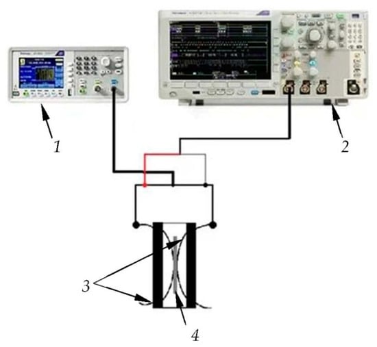 The experimental setup to determine the resonant frequencies of piezoplates: 1—signal generator; 2—oscilloscope; 3—clamping electrodes; 4—piezoplate.