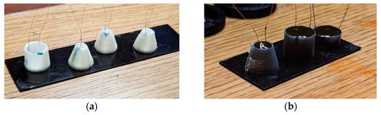 We manufactured the specimens using 3D printing technology from water-soluble PVA plastic. The equipment consisted of an injection mold in the form of a truncated cone with a hole in top for filling the damping mass. The base of the form was a circle with a radius equal to the radius of piezoplate. Such manufacturing technology is rather cheap, easy, and quick with regard to preparing forms, with a lack of technological maps, the possibility of automatic printing, and no requirements for the consistency of control. In addition, using a 3D printer, one can create a shape of any size and configuration. To fix the piezoceramics and forms, double-sided foamed tape was used.