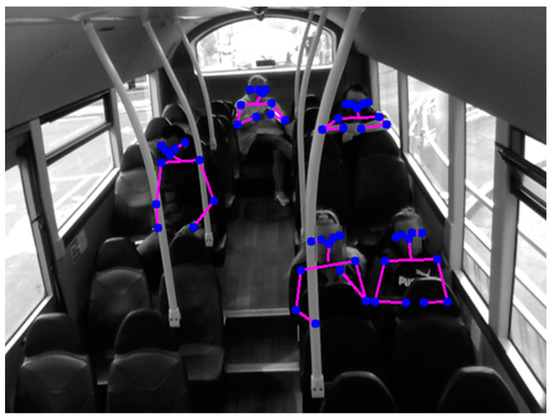 Detections were carried out utilising R-CNN R50-FPN 3× algorithm within Detectron2 framework [20]. A notable benefit of this algorithm is the inclusion of pose estimation—image Keypoint coordinates of 17 body part locations to allow imposed stick-man reconstruction (Figure 3). Keypoints were found for each passenger within each image by running all colour images through the Detectron2 predictor.