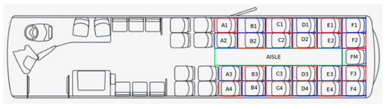 Figure 4. Labelled Seating Positions and Boundaries on Bus Plan. Several seats (A1, D2, D3, E2, E3, F1, F2, F3, F4) were omitted from calculations as passenger detections in these locations were inaccurate due to lack of visibility from unfavourable camera angle, obstructions, and degrading depth and image quality towards the back of the vehicle.- A total of 15 corresponding reference points were located on the image plane and a plan diagram of the bus model. Features such as the back of seat rests and handrail points were among reference points used;