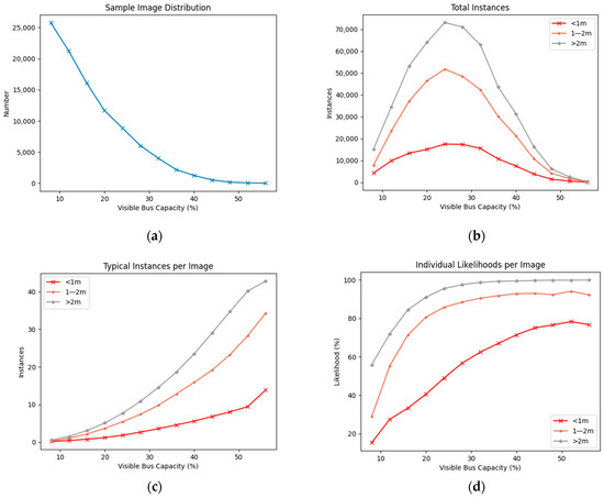 Out of the total number of images collected, 97,948 images contained at least two people that could be used for social distance measurements. Counting the number of passenger detections in each image reveals that (from what is visible to the camera) the bus typically has few people occupying it. As depicted in Figure 5a, there are 25,770 images of the bus at 8% occupation, 21,254 images at 12% occupation, and 16,107 images at 16% occupation. As the level of occupation increases, the number of available images continues to decline—until only seven images are available at 56% occupation. Following this point, no further samples were successfully captured, leaving higher occupations unexplored. Consequentially, an occupation of at and below 12% accounts for almost half of the available dataset.