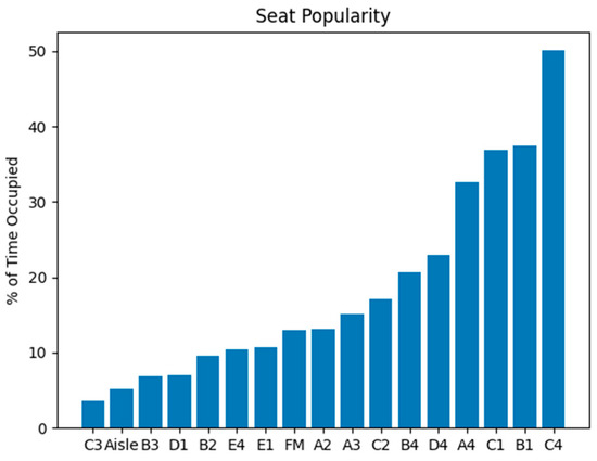 Seat Popularity by Percent of Time Occupied. Seating position C4 is the most popular choice for passengers, being occupied 50% of the time, while adjoining seat C3 is the least chosen.