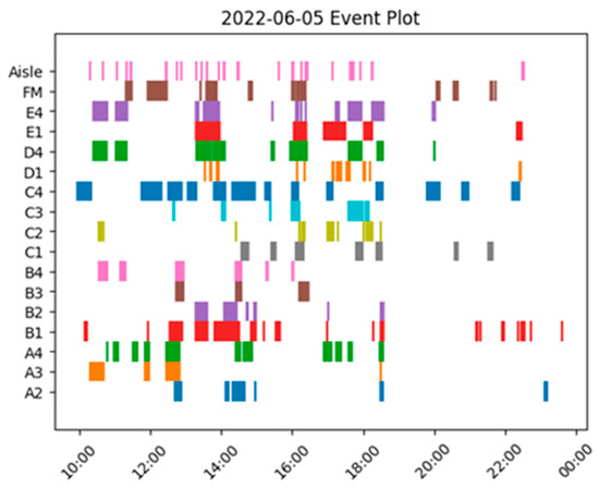 Event Plot for a single day, depicting which seats were occupied over the course of a day. Colours uniquely representative of each seating position. From such graphs and supporting data, choice seating patterns can be analysed for better transmission modelling.