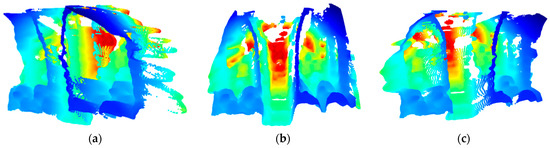 Point cloud visualisation from three perspectives, on a Hue, Saturation, Lightness (HSV) colourmap, with blue representing closer distances and red representing further distances from the camera, respectively. Point positions averaged from 89 frames (with no people in view) using median: (a) Perspective from front-nearside towards back-offside; (b) Camera perspective—centre position looking down aisle; (c) Perspective from front-offside towards back-nearside.
