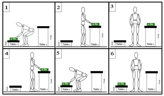 Description of the experimental setup: (1) Participant grasps a 16 lb. load from a Table 15 cm in height (Table 1); (2) Participant turns left and places the load on a different Table 75 cm in height (Table 2); (3) Participant goes to the neutral position; (4) Participant takes the load back from Table 2; (5) Participant turns right and moves the load to Table 1; and (6) Participant goes back to the neutral position. This figure is adopted and modified from our previous article [27]. Permission is obtained from the publisher.