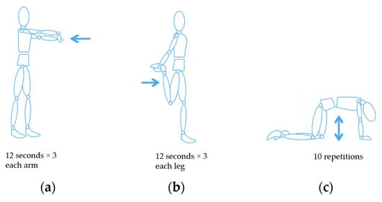 Stretching routine implemented in Schedule 3: (a) Participants straightened their arms in front of them and pulled their fingers back with the opposing hand; (b) Participants flexed their legs backward and pulled their feet with their arm; (c) Participants started with hands and knees on the floor and moved their spinal column to a round position toward the ceiling, with their chin toward their chest, then moved from this position to the opposite (i.e., approached their abdomen near the floor and head backward).
