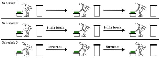 Difference between the three schedules: Schedule 1: perform the task continuously; Schedule 2: have a 1 min break after every one-third of the trial; and Schedule 3: perform the stretching routine shown in Figure 2 after every one-third of the trial. The green boxes represent the load being carried.