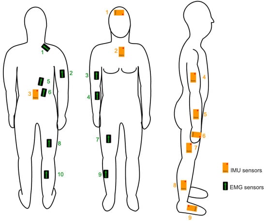 Location of IMU (orange boxes) sensors: (1) head, (2) chest, (3) pelvis, (4) upper arm, (5) forearm, (6) hand, (7) thigh, (8) shank, and (9) foot; and location of EMG (black boxes) sensors: (1) trapezius, (2) triceps, (3) biceps, (4) carpi radialis, (5) and (6) erector spinae, (7) rectus femoris, (8) bicep femoris, (9) tibialis anterior, and (10) lateral gastrocnemius.