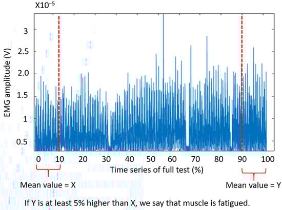 For instance, Figure 5 shows the flexor carpis radialis activity during a representative trial and how to detect fatigue based on a change in EMG amplitude. Once we identified the fatigued muscles (e.g., muscles A and B) and the percentage of their EMG amplitude increase (e.g., X% and Y%, respectively), we added these percentages for the fatigued muscles and obtained an accumulative fatigue measurement (i.e., the accumulative fatigue score = (X + Y)). For example, if a participant showed 26% and 18% increase in EMG amplitude of the bicep femoris and erector spinae, respectively, and did not show fatigue in any other muscle, then the accumulative fatigue score was calculated as 44 = 26 + 18. We observed that a change of EMG amplitude for less than 5% can occur due to various reasons, and might not be a true indicator of muscle fatigue. Therefore, the inclusion of muscles with an EMG amplitude change of less than 5% in the fatigue score could make the fatigue score sensitive to various sources of error. Thus, we did not include non-fatigued muscles in the fatigue score; see [27] for more details.